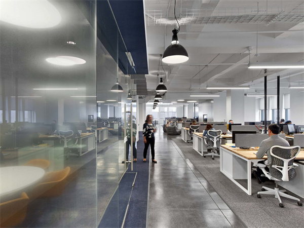 1400平媒体公司办公室装修设计:清朗凝练的空间更多了一份雍容典雅的都市气质,依旧以蓝色标志色为装饰主调,只是这次的蓝色更暗雅、更富于细腻的变化。极富质感的白蜡木材质与黑色碳钢构件制作的家具,呈现出特有的都市气质。闭合的洽谈室和会议室大多聚集于空间的内部,以尽可能留出沿窗的空间令视线不被遮挡。连续而开敞的玻璃窗,让室外城市美景尽收眼底,心情也变得豁然开朗。